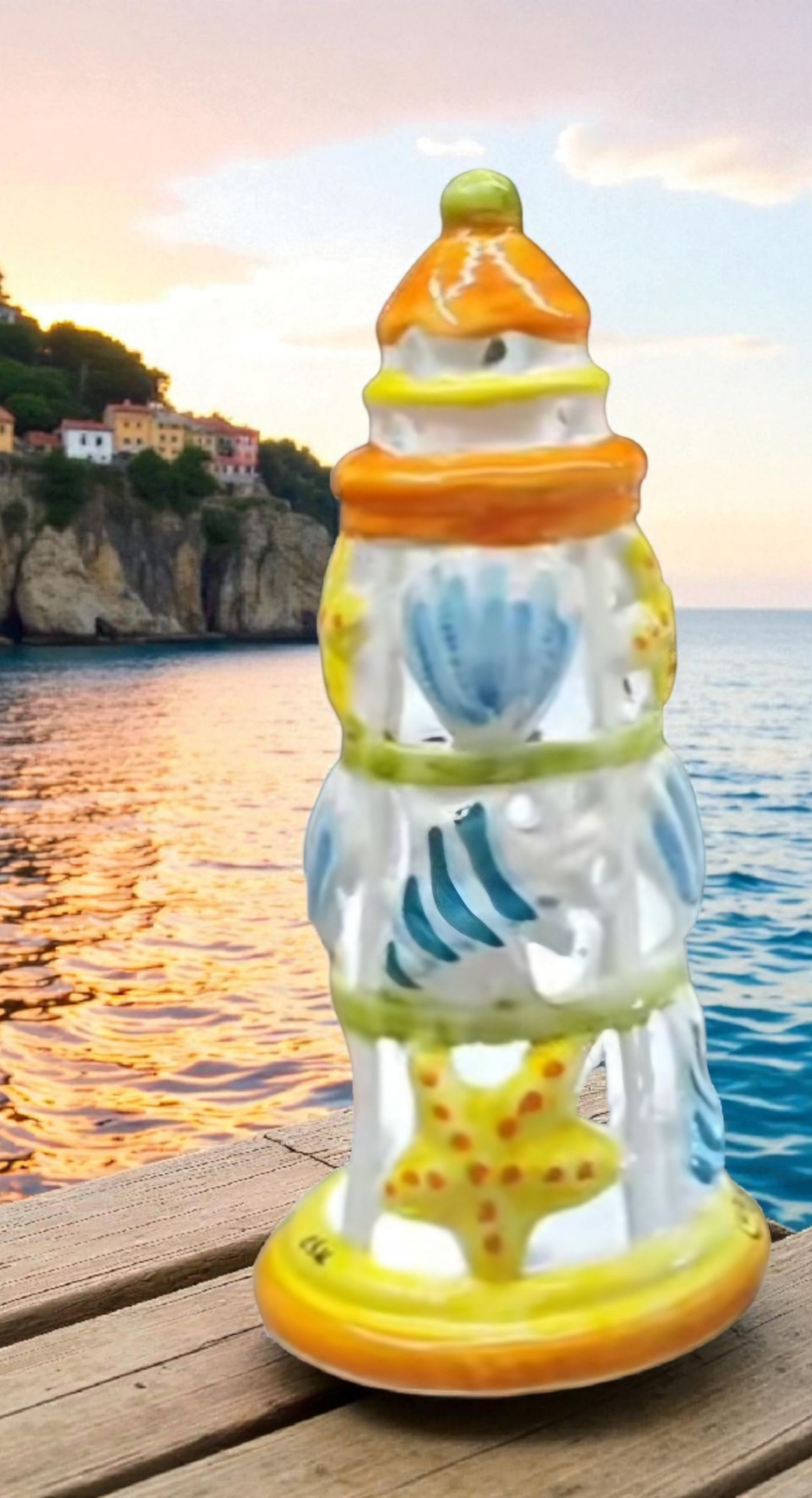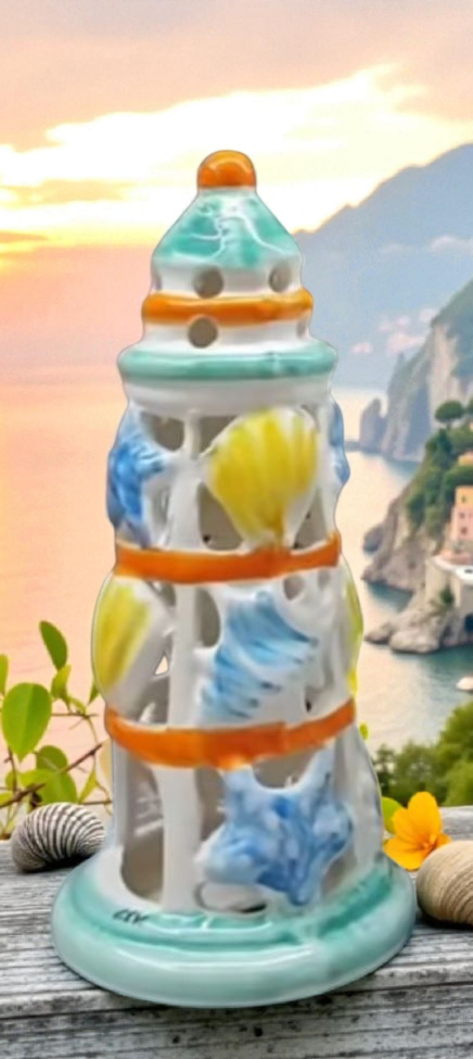 Un oggetto decorativo che unisce poesia e funzionalità, realizzato secondo l’autentica tradizione artistica italiana. Questo faro in ceramica dipinta a mano è impreziosito da trafori luminosi e dettagli marini, come conchiglie e stelle, che evocano l’atmosfera della costa mediterranea.